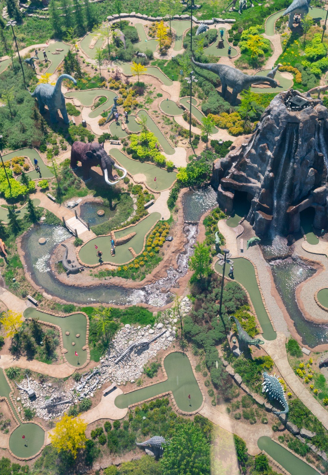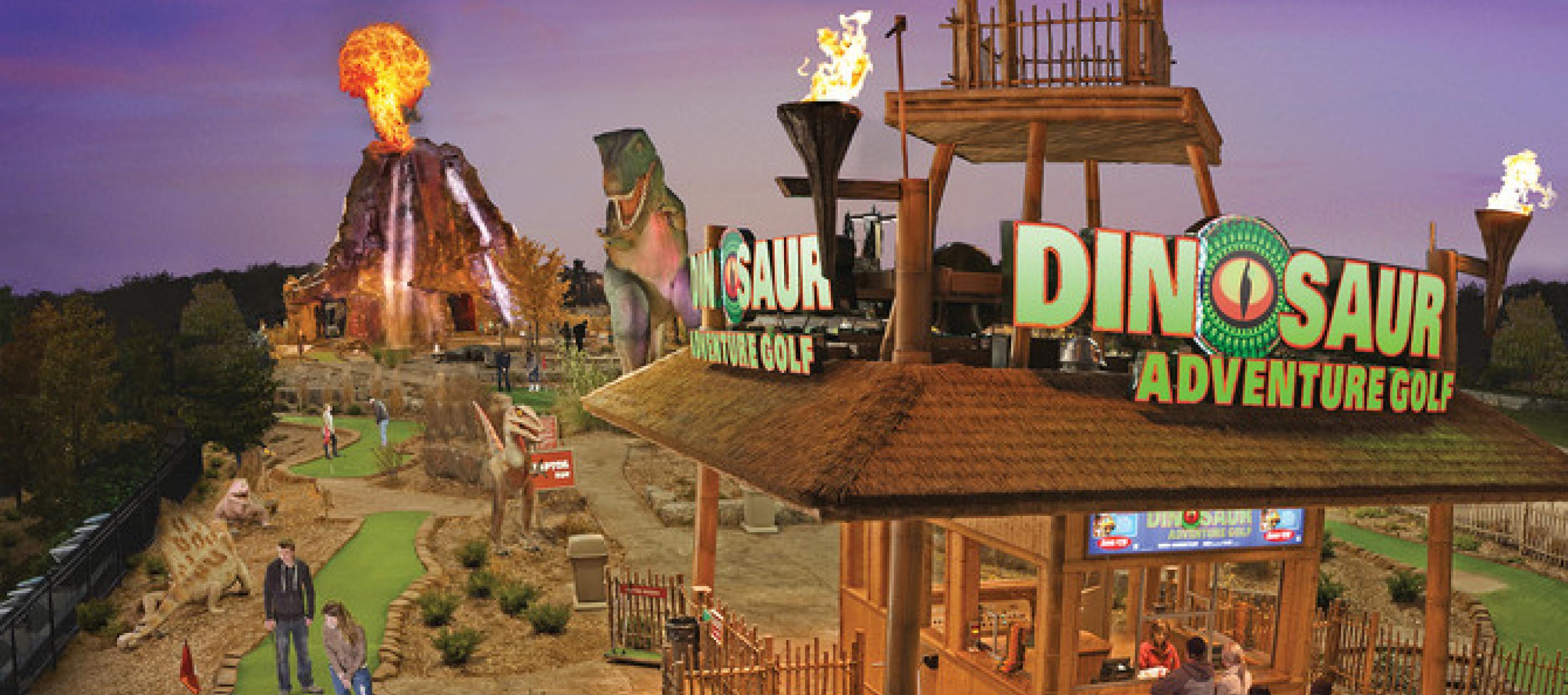As one of the nation's largest miniature golf courses, Dinosaur Adventure Golf features two 18-hole courses: 'Raptor' and 'T-Rex', 3 distinct decorative ponds with fast-moving rapids and bubblers and a 50 foot high "active" steam-erupting volcano that lets golfers play directly through a realistically eerie, cavernous volcanic interior.