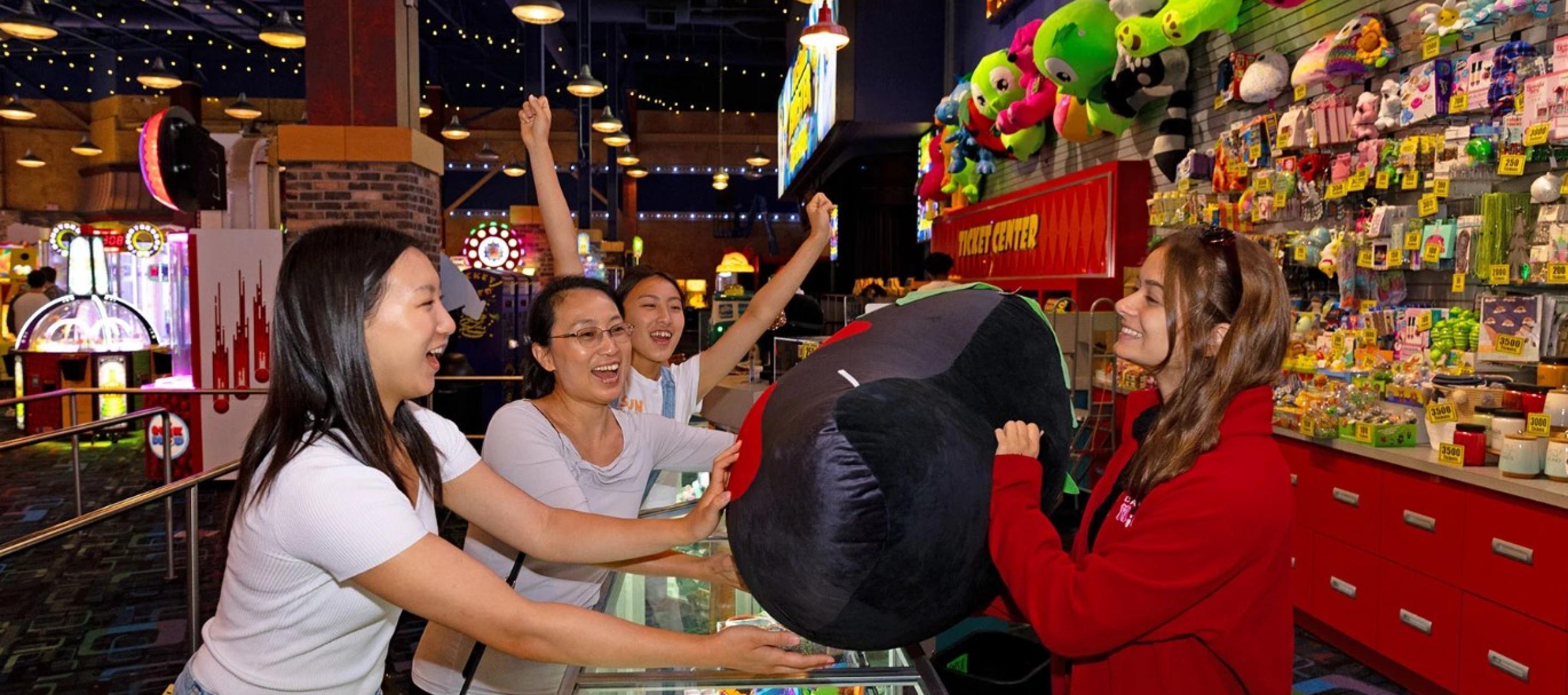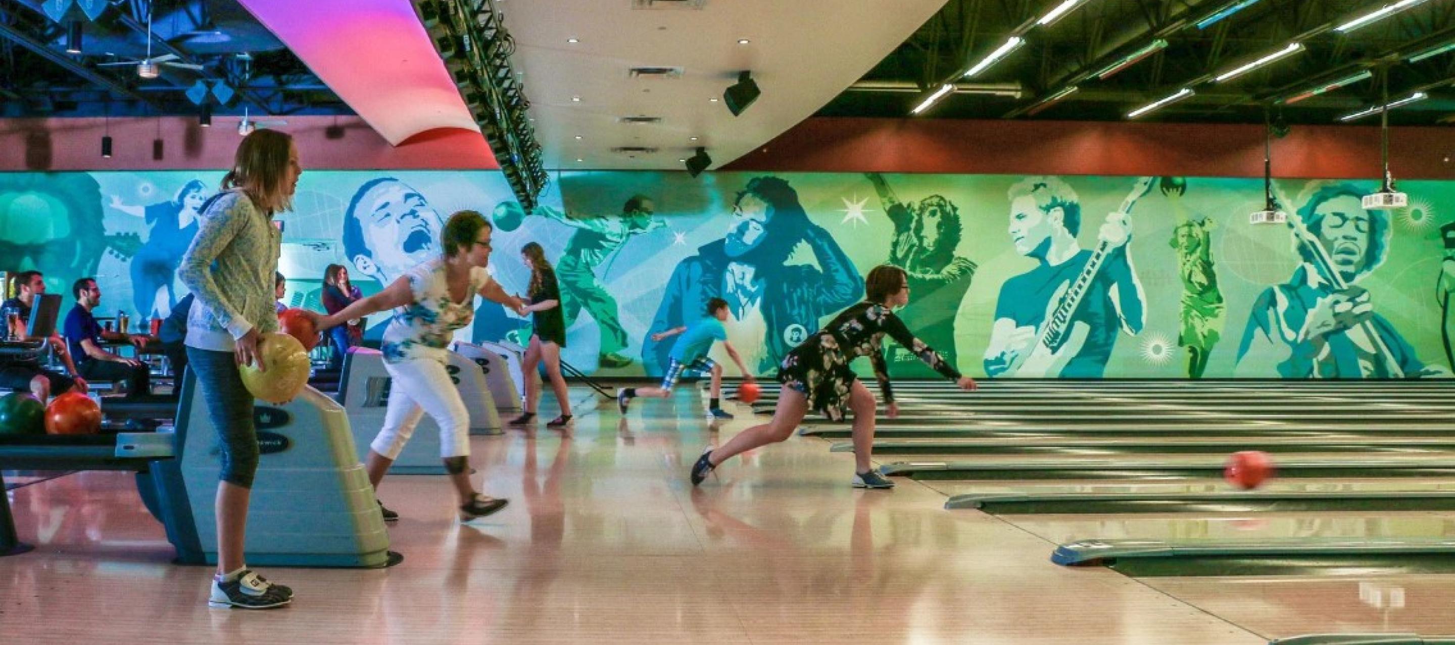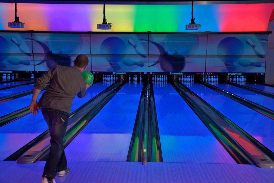 Here you'll find 14 full size 10 pin bowling lanes, a high-def audio/visual system, intelligent LED lane lighting and touch screen monitors for easy, automated scoring. Plus, with special bumper-rails that can be raised or lowered for each player, kids and novice bowlers don't have to throw gutter balls.