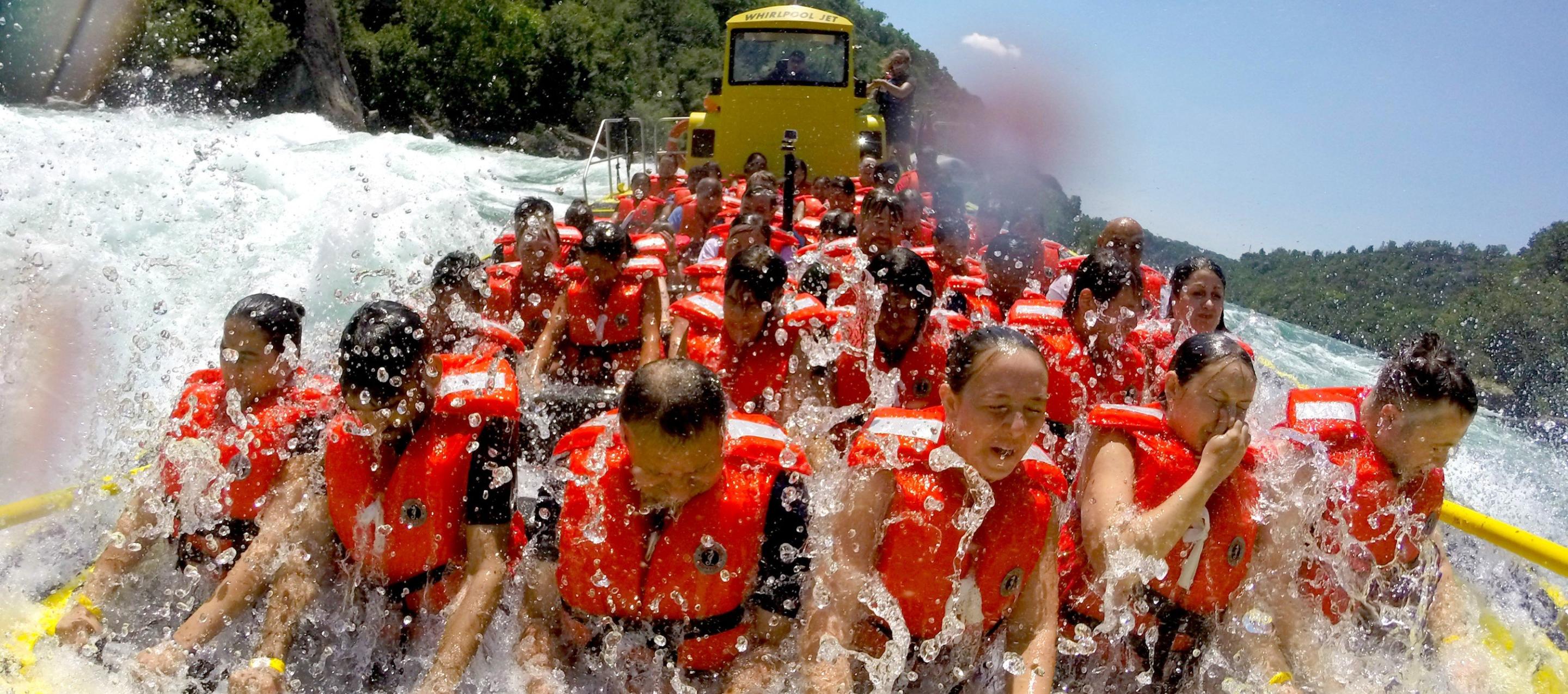 All of our tours follow the same route – a 45-minute round-trip adventure into the Niagara Gorge and through the Class V Rapids at Devil’s Hole. Our Wet Jet vessels are open-topped, and every single seat will get completely soaked! Our Freedom Jet vessel is mostly enclosed (dry Freedom Jet seats) but has 2 rows of outside wet seating at the very front. These are considered ‘power rows’, so guests must be a minimum of 13 years old and 100 lbs without any history of heart, neck or back issues. We only sell Adult tickets for the Freedom Jet WET seats.